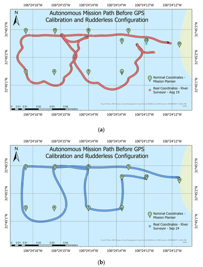 Comparison of the GPS calibration and the rudderless four thrusters’ system configuration: (a) mission path before calibration and (b) mission path after calibration.