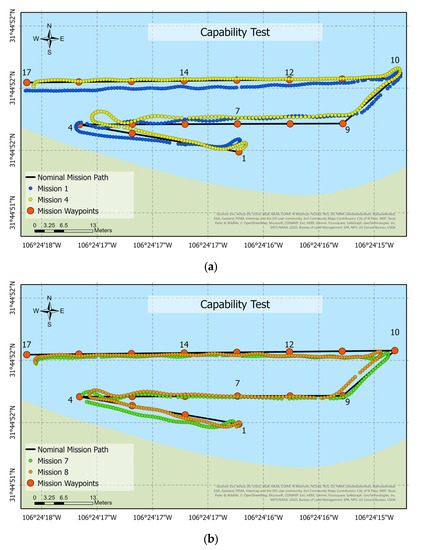 Capability study: (a) the path followed in missions 1 and 4 and (b) the path followed in missions 7 and 8. The numerical markers on the map correspond to the mission waypoints, which are labeled from 1 to 17.