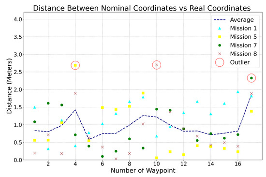 Figure 15 analyzes the Euclidean distance between each waypoint of the mission. The outliers are highlighted with a red circle. The waypoints 4, 10, and 17 illustrated an average deviation of 2.5 m. These were turning points where the platform struggled to maintain yaw control due to the weight and wind. Future work in steering control is required to optimize turning capabilities.