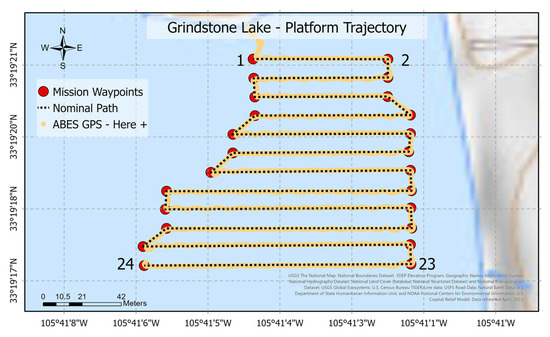 Three successful missions at Grindstone Lake provided a scenario to validate the product under real-world conditions in a broader area. The length of each mission was 1316.26 m, with a horizontal path from east to west and a total of 24 waypoints. Figure 16 shows the path followed by the vehicle to reach every programmed waypoint in a radius of 2.5 m between 01:20 p.m. and 03:40 p.m.