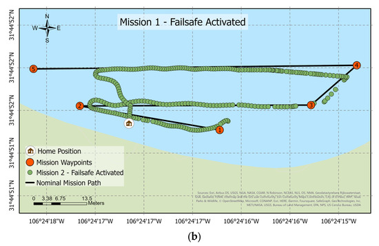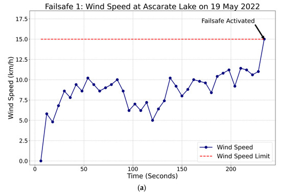 Autonomous boat ABES failsafe test: (a) the wind speed limit is 15 km/h and (b) the trajectory follows the vehicle when the failsafe is activated. The numerical markers on the map correspond to the mission waypoints, which are labeled from 1 to 5.