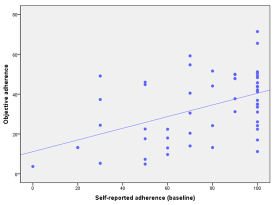 Participants’ median (IQR) self-reported adherence at a baseline of 90% (60–100) was significantly higher than the objectively measured adherence of 35% (19–48) (z = 6.19, p < 001). There was no statistical difference between the median (IQR) self-reported adherence reported at the baseline visit (90% (60–100)) and the second visit in the subset of n = 19 participants (80% (70–100)) (z = −0.26, p = 0.80).