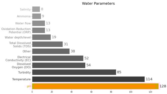Finally, other parameters related to water quality were measured and mentioned less frequently in the articles reviewed: TDS, ORP, BOD, Fluorescent Dissolved Organic Matter (fDOM), suspended solids, total nitrogen, dissolved organic matter concentration, ammonia, nitrate, nitrite, iron, and magnesium, among others. In addition, about 13% of the studies mentioned parameters not directly related to water quality but to hydrological characteristics (water resource morphology). These include water level/depth, pressure, and flow.