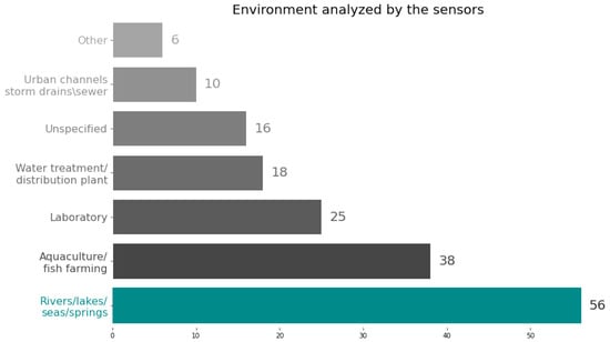 Figure 4 provides an overview of the number of papers that analyze sensor data in different environmental settings. The majority of the papers (56) focus on natural water bodies, with a specific emphasis on rivers (23), lakes and ponds (18), oceans, estuaries, and tidal channels (7), as well as aquifers and sources (8). Aquafarming applications (38) are the second most common area of focus. It should be noted that 16 articles did not provide information about the environmental context in which the sensors were tested.