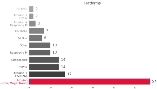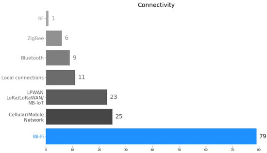 Among the parameters shown in Figure 3, pH stands out clearly. This can be partly explained by the fact that several papers on aquaculture/hydroponics [48,49,57,59,60,61,62,63,64,65,66,67,68,69,70,71,72,73,74,75] and the pH is closely related to the metabolism of various aquatic species, so its monitoring and control is essential in this activity. Moreover, together with temperature, this is the sensor with more options of brands/models and technological maturity to do measurements in the aqueous medium. On the other hand, the DO content in water, a crucial parameter for maintaining aquatic life in a given water body, is less measured, which could be related to the application field (most on aquaculture/hydroponics) and the difficulty of performing reliable DO measurements in real conditions. Clean water generally has higher dissolved oxygen concentrations, about 5 mg/L, due to photosynthesis by algae and physical processes associated with water movement [8].