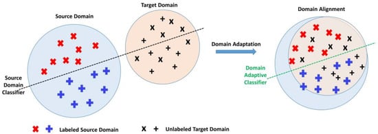 Example of unsupervised domain adaptation; Source domain and the target domain (left) are classified through a source-only classifier with source labeled data and target unlabeled data; Source and target domain (right) are classified after domain adaptation, which aligns the feature distributions of both domains.