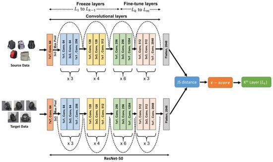 The proposed guided transfer learning approach is illustrated in Figure 2 and it is based on the ResNet-50 (Residual Network) architecture. This approach calculates the transferability score () to determine the optimal layer for fine-tuning the proposed algorithms and to guide the network on which layer to freeze and fine-tune during the training process. The transferability score () measures the effectiveness of the transfer learning algorithm to transfer the knowledge from the source domain to the target domain which can improve the performance of the target task . The indicates the similarity between source and target domains, which is used to identify the layers of the CNN to be frozen or fine-tuned. The value ranges in [0, 1]. Intuitively, if is near to 1, it shows less similarity between the and due to the high distribution distance between the domains. Thus, few or none of the CNN layers’ parameters can be transferred from the source model to the target model. If is near to 0, it indicates high similarity between the and and the CNN layers’ parameters can be transferred from the source model to the target model.