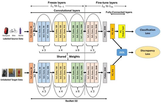 The proposed DAGTL-IC architecture consists of two streams of ResNet-50 networks for the source and target domains with weight parameter sharing, as illustrated in Figure 3. We pass labeled source domain data to the source network and unlabeled target domain data to the target network. The last layer of the ResNet-50 network, which is a fully connected layer with 1000 neurons, is omitted. The last convolutional layer is converted to a flattened layer and comprises 2048 neurons. After this flattened layer, we added one additional bottleneck layer with 512 neurons. The bottleneck layer takes the input from the flattened layer of both the source and target streams and computes the domain discrepancy loss using JS-Distance which reduces the distance between the domain distributions and finds domain invariant features. The last layer of ResNet-50 is modified based on the number of classes available in the domains for classification. The proposed architecture is trained using the guided transfer learning approach based on the layer selection strategy to select which layers are kept frozen and which layers are fine-tuned as mentioned in Section 3.2, instead of a random selection of layers. The first stream uses labeled source data to train a classifier using the cross-entropy loss function and both streams use data from both domains to find the discrepancy loss using JS-Distance between the domains. These loss functions are explained in the following section and Algorithm 2 presents the steps to perform the proposed approach DAGTL-IC. During inference, the fine-tuned network is directly applied to the target domain for the target task.
