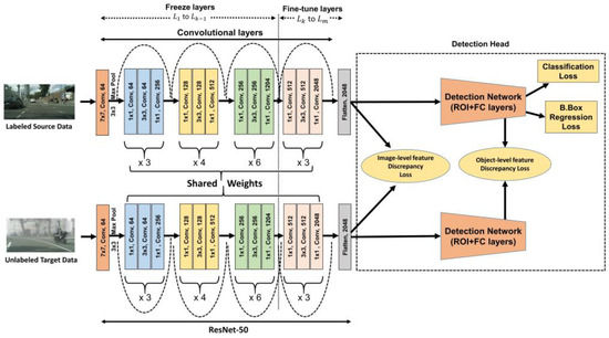 The proposed DAGTL-OD architecture consists of two streams of the object detection network for source and target domains as illustrated in Figure 4. Faster R-CNN and SSD object detection networks are utilized in the proposed method. Faster R-CNN is a two-stage object detection network and has three main components: backbone CNN layers, a Region Proposal Network (RPN) for generating region proposals, and a Region-of-Interest (ROI) based classifier Network (RCN) for the classification of objects and predicting bounding boxes. SSD is a one-stage object detection network that directly classifies objects from the features map. Our approach can be applied to both types of object detection networks. We pass the annotated images of the source domain and unlabeled images of the target domain to the proposed model. We use the ResNet-50 model as the backbone of the detection network and its features are shared between both streams. Instead of selecting random layers to fine-tune, we utilize the guided transfer learning strategy mentioned in Section 3.2 to train the base layers of the network. The feature vectors from the flattened layers of ResNet-50 are then passed to the detection head to predict the object coordinates and their categories. Both networks are jointly trained to minimize the loss function , which is composed of the classification loss and regression loss for object detection in the source network. The regression loss is used to find the accurate bounding box of the objects in the given image. Moreover, we utilize two types of domain losses in the proposed network training: image-level domain discrepancy loss and object-level domain discrepancy loss. These losses and the overall objective function for domain adaptive object detection are presented in the following section and Algorithm 3 presents the steps to perform the proposed approach DAGTL-OD. Once the domain invariant features are learned from the training of both networks, these features are directly utilized to detect objects in the target domain by the fine-tuned network.