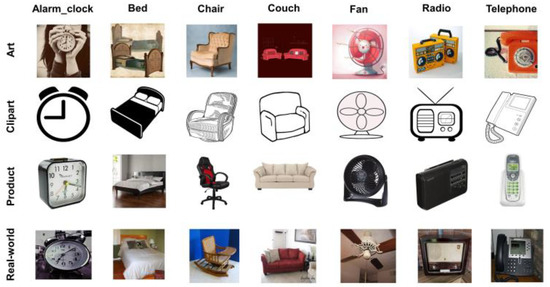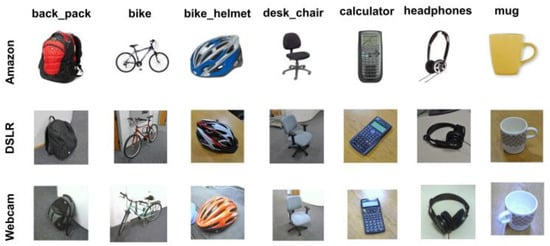 Office-31 [37] is a widely used image dataset in domain adaptation for an image classification task. It comprises three distinct domains, namely Amazon (A), Webcam (W), and DSLR (D) with 31 categories and 4110 images in total. Amazon contains 2817 images collected from the amazon.com website with a white background, Webcam has 795 low-resolution images and DSLR covers 498 high-resolution images. This dataset constructs six transfer tasks with one domain as the source and another as the target domain: A → W, A → D, W → A, W → D, D → A, D → W. Sample images are illustrated in Figure 5.