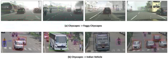 Domain adaptation is essential when changes occur in intra-class variations, camera sensors, geographic areas, or environmental setups. We investigate the adaptability of our method for such changes by considering the Cityscapes dataset as the source domain and the Indian Vehicles dataset as the target domain. To the best of our knowledge, this transfer task (Cityscapes → Indian Vehicles) is the first of its kind. Both are real datasets and we consider five categories including car, truck, bus, motorcycle, and bicycle from both datasets for our experiments. Table 7 shows the results of our method with Faster R-CNN and SSD object detector models and compares them with Faster R-CNN only. It can be seen that we obtain a significant improvement in the performance of the proposed object detector with Faster R-CNN and SSD by 12.5% and 14.7%, respectively. This proves that our work outperforms the above domain adaptation challenge and reduces the distance between the distributions of the two domains. Output images are illustrated in Figure 8b.