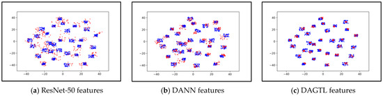 To verify the feature transferability of the proposed DAGTL approaches, we utilize t-Distributed Stochastic Neighbor Embedding (t-SNE) [60] to visualize the learned feature embedding of the A → W task. Features are taken from the bottleneck layer after the convergence of the A → W task. ResNet-50 features, DANN features, and DAGTL-IC features are plotted in Figure 9—(a), (b), and (c), respectively. Figure 9a represents the source and target features under the source-only setting, and it is observed that target features are not aligned, indicating a need for domain adaptation. In Figure 9b, DANN discriminates between the source and target features, but there is still a distance between the two domain features. Our proposed DAGTL algorithm aligns the source and target samples the most, as shown in Figure 9c, and shows better intra-class separation and intra-class clusters. This indicates that DAGTL is capable of learning more transferable features, enabling it to effectively adapt to new domains with better feature discrimination.