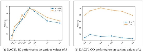 We investigate the sensitivity of the parameter λ on classification tasks A → W and A → D and object detection tasks C → F and C → I. Figure 10a,b illustrate the classification and object detection performance of these transfer tasks by considering λ ∈ {0.1, 0.2, 0.4, 0.5, 0.6, 0.8, 1, 1.5, 2} for classification and λ ∈ {0.1, 0.2, 0.4, 0.6, 0.8, 1} for object detection. The trade-off parameter λ balances the contributions of domain discriminative loss in the overall objective function which leads to obtaining more discriminating features. Figure 10 reveals that the accuracy increases gradually until λ = 0.8 for classification and λ = 0.2 and 0.4 for object detection, then accuracy decreases as λ increases, following a bell-shaped curve. This demonstrates the effectiveness of λ in joint training of learning the classification task and discriminative features for domain adaptation which improves the feature transferability.