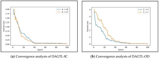 Figure 11a,b depict the convergence analysis of DAGTL-IC on transfer tasks A → W and A → D and DAGTL-OD on transfer tasks C → F and C → I with Faster R-CNN. The convergence graph shows that DAGTL models can stabilize after some iterations. It proves that DAGTL models are superior for cross-domain training with the combined loss of classification or detection loss and domain discriminative loss. Moreover, DAGTL methods converge in fewer iterations compared to adversarial-based approaches [23,28,32,52,53] where specific adversarial network training is required to learn transferable and discriminative feature representations.