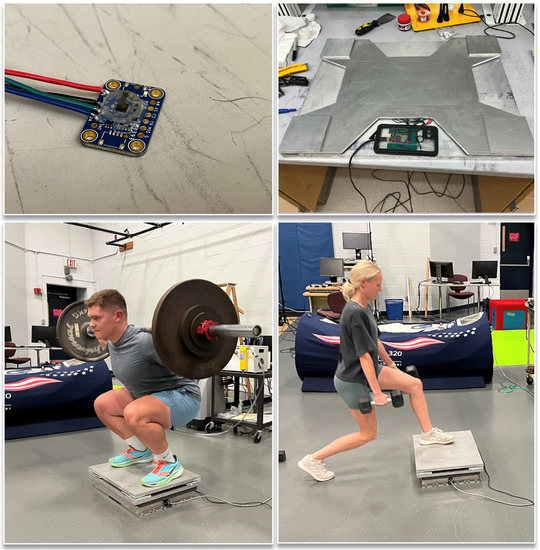 Images of a single sensor unit (top left), the assembled experimental force plate (top right), and participants performing weighted squats (bottom left) and lunges (bottom right) atop the Bertec (ground truth) force plate and the experimental force plate.