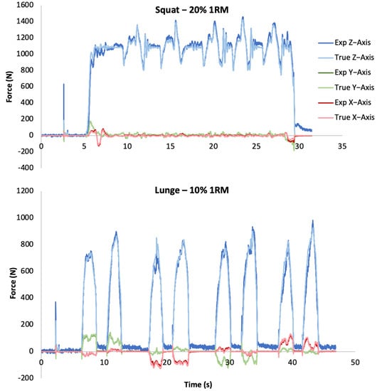 The absolute and relative RMSE for each axis of both movements is displayed in Table 2. The relative RMSE values indicate the experimental force plate performed with lower relative error in the shear (X and Y) axes than the vertical (Z) axis during both lunges and squats. The vertical axis during lunges displayed the highest error.