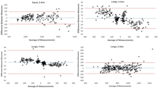 Bland–Altman plots for the peak forces measured during each repetition from all participants for the X-, Y-, and Z-Axes of the Lunge movements as well as the Z-Axis for the squat movements. Residuals and averages of measures are in units of Newtons (N). Blue line represents the mean, and red dotted lines represent 95% confidence intervals.