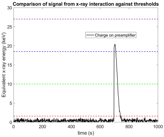 Photon counting works by comparing the signal out of the sensor (in this case the charge on the preamplifier, black line) against a pre-set threhsold (dashed lines). A threshold (red dashed line) is set so as to be several standard deviations from the mean of the electronic noise so false counts from noise are extremely unlikely. In an x-CSI system, additional thresholds are employed (green, blue and purple dashed lines), so that the energy of the photon can be more accurately estimated. In this instance, the incoming photon can be seen to be at some energy between 18.5 and 27 keV (the blue and purple threhsolds respectively).