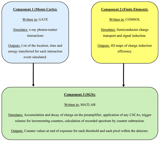 All simulations detailed in this work are performed using the previously validated simulation framework known as CoGI. CoGI was developed at the Institute of Cancer Research and the Royal Marsden NHS Foundation Trust by the Multimodality Molecular Imaging team for the purpose of modelling and optimising x-CSI detectors and is comprised of three primary components, as shown in Figure 2. Full details of this simulation framework can be found in previous publications [17,18], so only a brief overview will be given here.