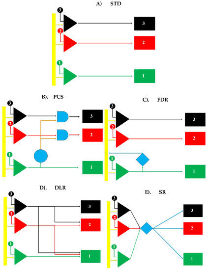 Schematics for the various count triggering schemes simulated in this work. Common symbols: Yellow rectangle (preamplifier), green/red/black numbered triangles (comparator to provide a threshold), green/red/black numbered rectangles (counter associated with same numbered/coloured comparator), straight lines (connections). Unique symbols: in (B), blue “D” shapes represent logical AND gates and the blue circle represents a device to provide an input of finite duration to the AND gates (e.g., a capacitor). In (C), the blue diamond represents a delay circuit which provides an offset, dt, between being triggered and resetting the anode (yellow rectangle). In (E), the blue diamond represents a second stage integraing circuit which counts the number of thresholds recently triggered (using an adjustable baseline) and then triggers that number of counters from lowest to highest.