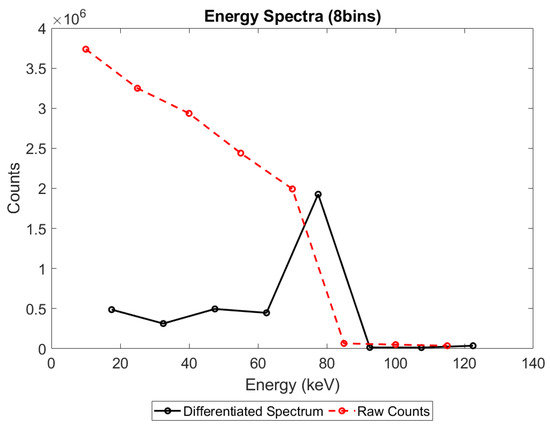 Raw counts from threshold counters (red dashed line) and the energy spectrum that is calculated as a result of counter subtraction (black solid line), as described in text. Data obtained from a simulated system with 8 energy bins, 108 X-ray photons mm−2 s−1, 2 mm thick sensor, and 400 µm pixel pitch. 8 bins were chosen as this is the most used in a commercial x-CSI ASIC to date.