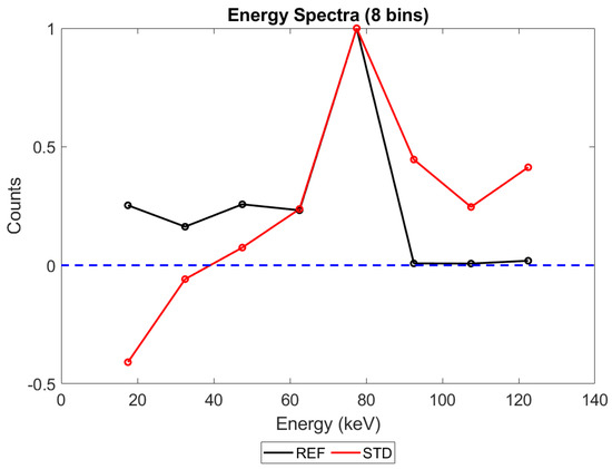 Comparison of the calculated energy spectrum produced by an ideal counting scheme (REF, black line) and the currently used counting scheme (STD). Data obtained from a simulated system with 8 energy bins, 108 X-ray photons mm−2 s−1, 2 mm thick sensor, and 400 µm pixel pitch. Blue dashed line corresponds to zero counts and is added to allow negative counts to be more easily visualised.