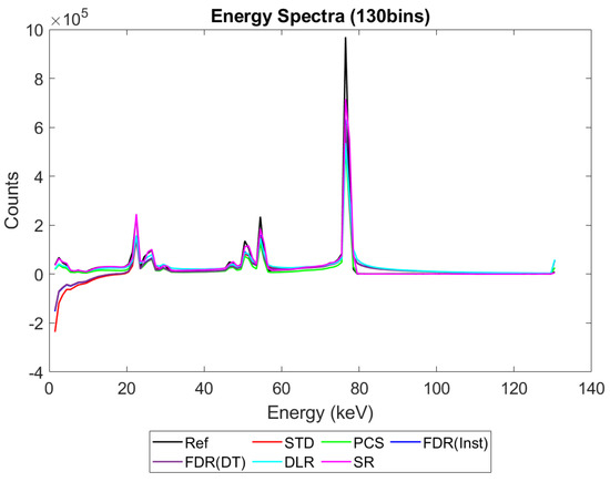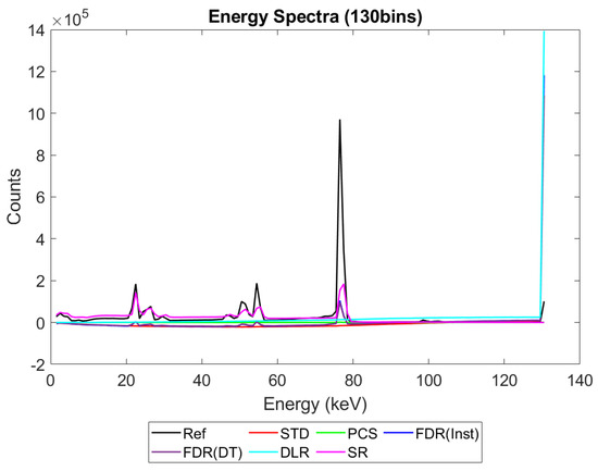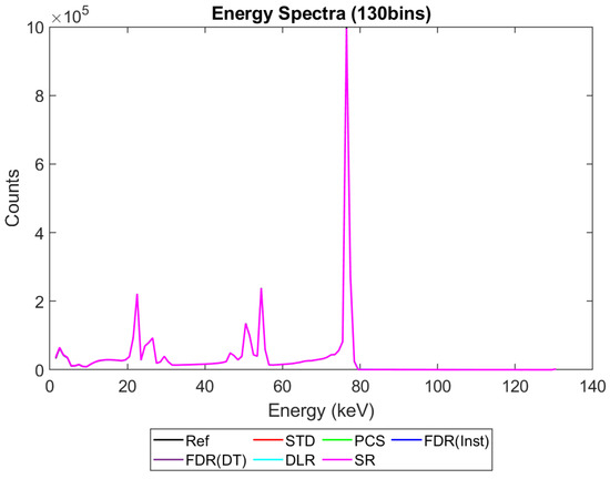 Energy spectrum obtained from a system with a 1.5 mm sensor thickness, a 250 µm pixel pitch, and 130 energy bins. The X-ray flux simulated was 107 photons mm−2 s−1. All spectra are plotted; however, they perform equally well at most energies at this flux, with only slight differences visible at the lowest and highest energies (where FDR and DLR respectively are visibly different).