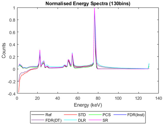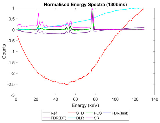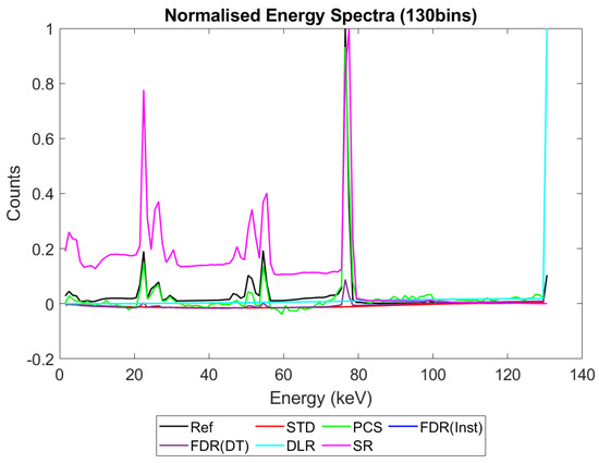 Figure 9, Figure 11 and Figure 12 also show that the FDR schemes combine the performance of STD and PCS schemes. FDR schemes exhibit a large rise in counts in the last energy bin (obscured by the DLR data) and broadly track the base count rate of the STD system, including the broad negative count regions. Though negative overall, the FDR schemes still retains an appreciable level of spectral features and a modest count rate, with spectral features visible in the raw spectra without normalisation.