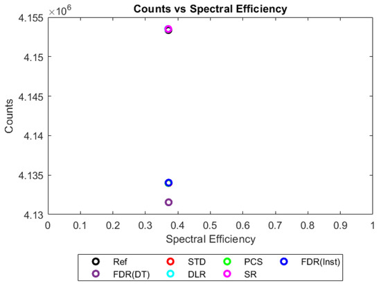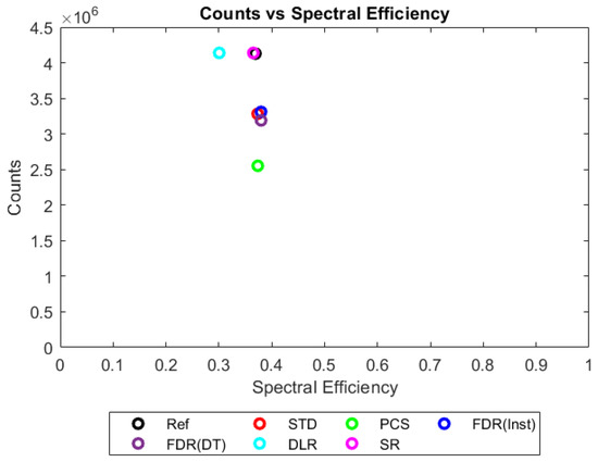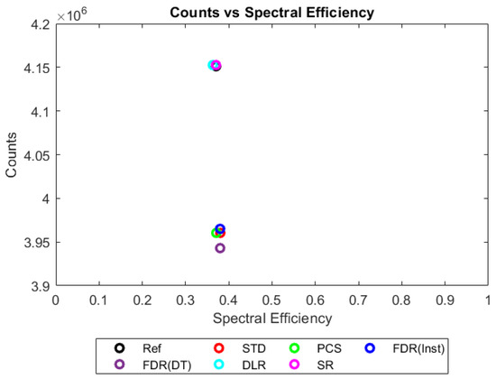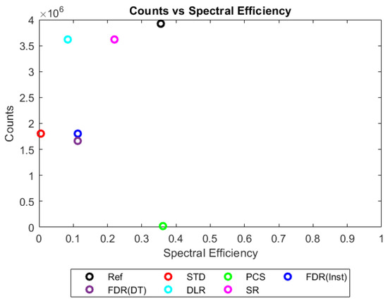 Combined, the drop in the spectral efficiency with an increasing number of bins and the drop in the count rate at the lowest numbers of bins produce the bowl-shaped curves with local maxima seen in Figure 20 for the STD, DLR, and FDR schemes.
