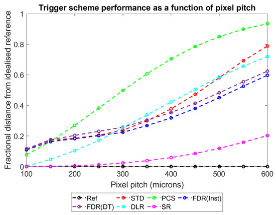 Considering first the FDR schemes, we can divide their relative performance into three regions and the behaviour can be explained by remembering that pileup increases with pixel pitch. In the pitch range of 100–150 µm, FDR schemes do not differ significantly from the STD scheme as the time between photon interactions is sufficiently long that events are so unlikely to interact that they appear independent. Between 150 and 350 µm the time between interactions is long enough that charge can discharge between events, but sufficiently short that the finite reset time of the FDR(DT) scheme leads to counts being missed during resetting, and so the FDR(DT) scheme performs worse than the STD and FDR(Inst) schemes. Finally, above 350 µm, both FDR schemes outperform the STD scheme, though the FDR(DT) still slightly underperforms FDR(Inst). This is consistent with the average time between photon interactions now being so short that the probability of a photon interaction occurring in a pixel that has cleared its previous charge is low. In such a situation, the advantage to accurate energy estimation from forced resetting of the pixel is greater than the disadvantage of missed counts during the finite deadtime of the reset.