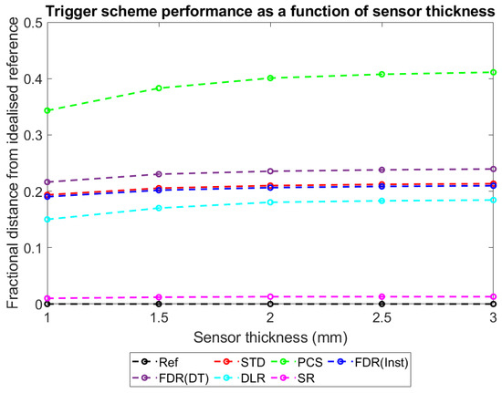 To more intuitively visualise trends in the large data set collected, and to assess the adequacy of the proposed mechanisms for explaining these trends, the dimensionality of the data was reduced further as described in Section 3: Results. Plots of counts vs. spectral efficiency were produced for each simulated irradiation, with axes normalised such that the REF data point had coordinates (1,1). The distance between each count-triggering scheme and the idealised reference data in the 2D plane was then calculated, providing a single metric for overall system performance which ranged between 0 (performs as well as the idealised reference) and ~√2 (worst possible performance). By this metric, a given percentage drop in either counts or spectral efficiency is weighted equally. This may not be the case for all applications; however, the method is readily adapted by changing the relative lengths of the two axes to reflect the relative importance of each metric. Figure 17, Figure 18, Figure 19 and Figure 20 show how this metric varies as a function of the four simulated variables: pixel pitch (Figure 17), sensor thickness (Figure 18), X-ray flux (Figure 19), and number of energy bins (Figure 20). The reference system on which each parameter is varied for this study had a pixel pitch of 250 µm, a sensor thickness of 1.5 mm, an X-ray flux of 107 photons mm−2 s−1 and 130 energy bins.