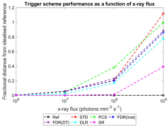 Figure 6, Figure 7, Figure 8 and Figure 9 show the X-ray spectra recorded by the various trigger schemes at a range of clinically relevant X-ray fluxes (106–109 photons mm−2 s−1) compared with the spectrum that the reference system would produce. At very low to mid fluxes (106–107 photons mm−2 s−1), all trigger schemes appear to perform equally well: so similarly, in fact, that they cannot be distinguished in Figure 6 at all. Slight differences between the count-triggering schemes can be seen at the lowest and highest energies in Figure 7, where the trigger schemes are split into two groups: SR, DLR, and PCS match the reference data more closely than STD and both versions of FDR, which all experience a slight reduction in counts at this point, an indication that pulse pileup is beginning to creep into the simulation and cause reductions to the counts in the lowest energy bins as described in Section 4.1. DLR also produces a very slight over-count at the highest energies, but broadly speaking there is little difference between the various trigger schemes at these fluxes. This is reassuring as it implies that the proposed trigger schemes do not suppress negative counts at the expense of their performance in low flux regimes.