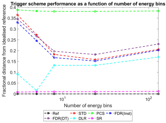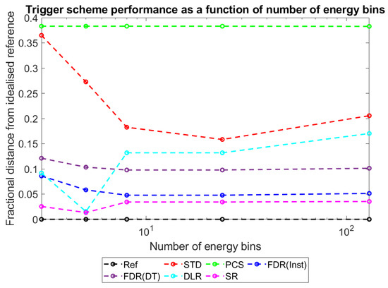 Finally, Figure 20 shows how count-triggering scheme performance varies as a function of the number of energy bins used. It is important to remember that the changes in performance are shown with respect to the idealised reference system and are thus not comments on absolute performance. It appears that for most schemes considered (STD, DLR and both FDRs) there is an optimal number of energy bins at which their performance is maximised, with this value being lower for the DLR scheme (5 energy bins) than the others (24 energy bins for the STD and FDRs). The shape of these dependencies is reliable across a wide range of data sets chosen at random from the simulated systems: FDR and STD schemes have a clear bowl shape, DLR has a similar shape, however often with a sharp localisation of the peak performance, and both SR and PCS show a near flat response. The sharp local dip in the DLR data at 5 energy bins is unexpected and is not easily explained by the mechanistic explanations given thus far. A computational anomaly in a single data set was ruled out after noting that this feature is still present over a wide range of X-ray fluxes, pixel pitches and sensor thicknesses. Identifying the causes of this dip would require further simulation work, with more energy bin numbers near to this peak (e.g., 4, 5, 6, and 7), to evaluate the nature of the change observed. This is beyond the scope of the current investigation, though may be the topic of future work, should the DLR scheme prove popular/applicable for a specific application.