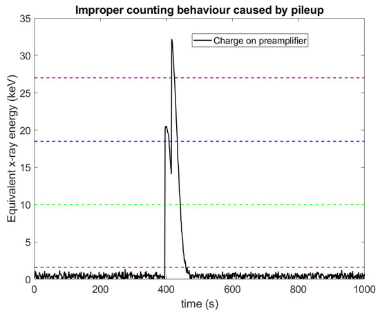 - the energy of incident photons is more likely to be located near to a threshold above them, making it easier for the residual charge from a previous event to push the signal into the wrong energy bin;