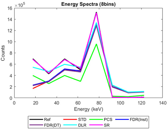 Data used to produce Figure 8 (sensor thickness 1.5 mm, pixel pitch 250 µm, and X-ray flux 108 photons mm−2 s−1) processed with 8 energy thresholds instead of 130. Note that the negative counts seen when 130 thresholds are used now appear simply as lower counts in the lowest of 8 energy bins. The REF data set lies almost exactly behind the SR data set.