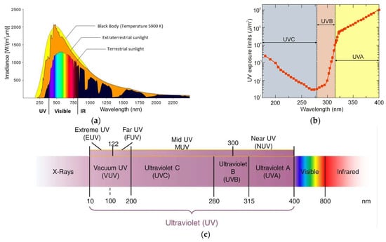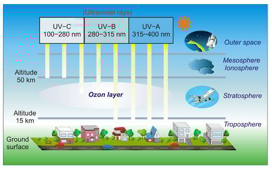 - The Ozone Hole. Available online: https://www.theozonehole.org/images/uvrayjp.gif (accessed on 22 December 2022).