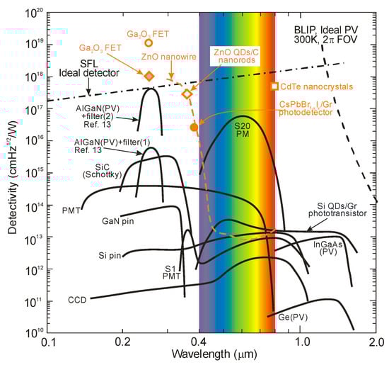 - Li, X.; Zhu, C.; Zhu, X.; Xu, Z.; Zhuang, X.; Ji, X.; Yan, F. Background limited ultraviolet photodetectors of solar-blind ultraviolet detection. Appl. Phys. Lett. 2013, 103, 171110. [Google Scholar] [CrossRef]