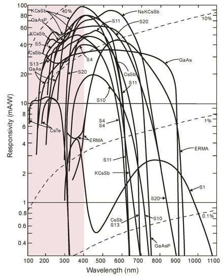 - Seib, D.H.; Aukerman, L.W. Photodetectors for the 0.1 to 1.0 μm Spectral Region. Adv. Electron. Electron Phys. 1973, 34, 95–221. [Google Scholar]