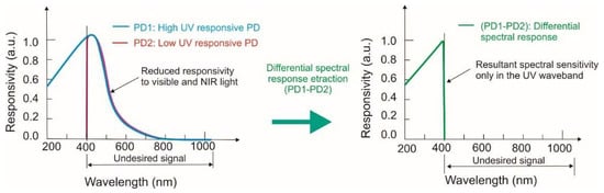 - Sipauba Carvalho da Silva, Y.R.; Koda, Y.; Nasuno, S.; Kuroda, R.; Sugawa, S. An ultraviolet radiation sensor using differential spectral response of silicon photodiodes. In Proceedings of the 2015 IEEE SENSORS, Busan, South Korea, 1–4 November 2015; pp. 1–4. [Google Scholar]