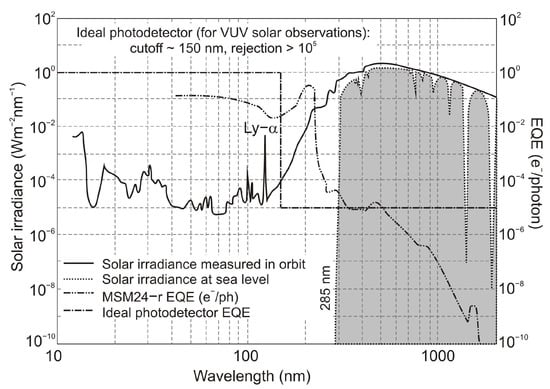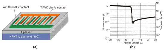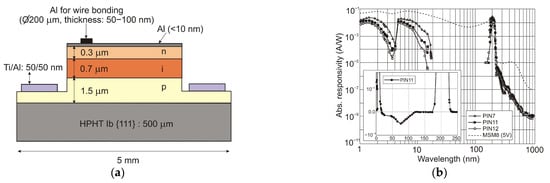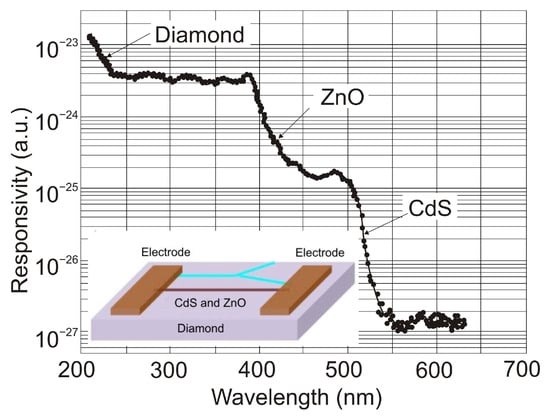 - BenMoussa, A.; Soltani, A.; Haenen, K.; Kroth, U.; Mortet, V.; Barkad, H.A.; Bolsee, D.; Hermans, C.; Richter, M.; De Jaeger, J.C.; et al. New developments on diamond photodetector for VUV solar observations. Semicond. Sci. Technol. 2008, 23, 035026. [Google Scholar] [CrossRef]