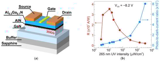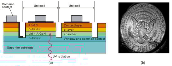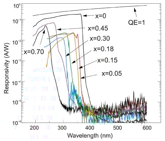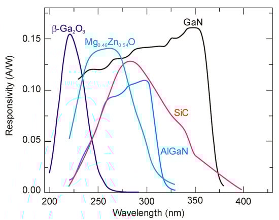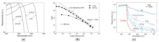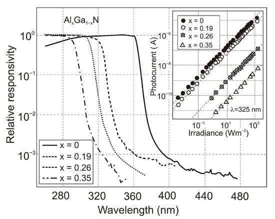 - Misra, M.; Korakakis, D.; Ng, H.M.; Moustakas, T.D. Photoconductive detectors based on partially ordered AlxGa1−xN alloys grown by molecular beam epitaxy. Appl. Phys. Lett. 1999, 74, 2203–2205. [Google Scholar] [CrossRef]