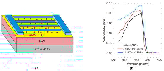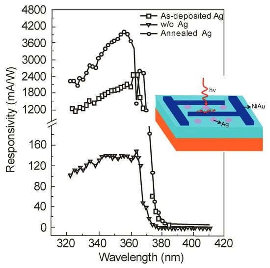 - Chang, S.; Chang, M.; Yang, Y. Enhanced Responsivity of GaN Metal–Semiconductor–Metal (MSM) Photodetectors on GaN Substrate. IEEE Photon. J. 2017, 9, 1–7. [Google Scholar] [CrossRef]