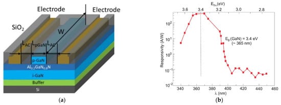 - Lyu, Q.; Jiang, H.; Lau, K.M. High gain and high ultraviolet/visible rejection ratio photodetectors using p-GaN/AlGaN/GaN heterostructures grown on Si. Appl. Phys. Lett. 2020, 117, 071101. [Google Scholar] [CrossRef]
