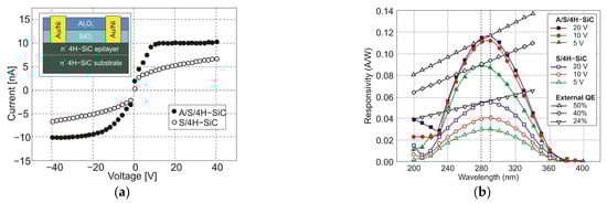 - Brendel, M.; Helbling, M.; Knigge, A.; Brunner, F.; Weyers, M. Solar-blind AlGaN MSM photodetectors with 24% external quantum efficiency at 0 V. Electron. Lett. 2015, 51, 1598–1600. [Google Scholar] [CrossRef]