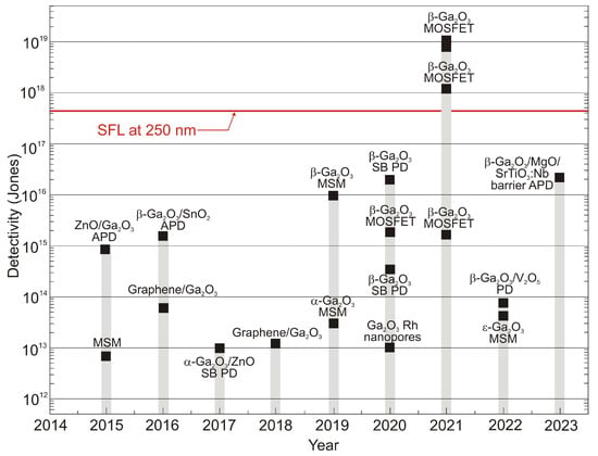 | β-Ga2O3 | 254 | 4.24 × 104 | 2 × 105 | - | - | 1.7 × 1011 | - |