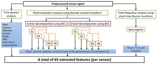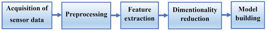 Feature extraction allows for reaching meaningful information about the underlying process. However, it is quite intricate, if not impossible, to theoretically determine the optimal sensory features for the problem at hand. This is mainly due to the complexity and dynamics of the industrial processes being monitored and the presence of diverse factors affecting the importance of a given feature, including the operating conditions [4,7,8], position of sensors, signal-to-noise ratio of the acquired signals [8], the window size of feature extraction [9], etc. Therefore, in order to ensure that sufficient information is derived, many features are initially extracted from the sensor signals in the time, frequency, and/or time-frequency domain. However, some of these features might be irrelevant and redundant [6], and the number of extracted features might be too large, causing the overfitting problem [8,10]. Hence, the role of the subsequent step, i.e., dimensionality reduction, is to provide a feature vector of a lower dimension while keeping the most representative information from the original features.