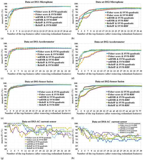 - It is common in the literature to assess the candidate sensors based on the relevance of the features extracted from their signals, as performed in [4,24,25]. Such an assessment is especially important when there is a constraint on the number of the sensors to be used. In addition, the selected features in the offline phase will determine which signal analysis to be used in the online phase, e.g., fast Fourier transform, wavelet transform, etc. Thus, the FS stability can also affect the confidence in selecting the sensor(s) and signal analysis methods.