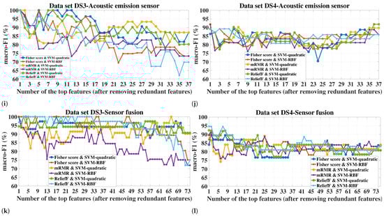 As mentioned previously, redundancy among features are not taken into account by both Fisher score and ReliefF. However, redundant features, even if relevant to the class, increase the data dimensionality without necessarily enhancing, or even degrading, the representation of the process at hand. It was experimentally shown in [4] that, for a constant number of 5 features, an increase in the assessment accuracy of the milling tool was gained by simply replacing more-important yet redundant features with less-important but non-redundant ones. Additionally, it was shown in [51] that a more accurate fault diagnosis was achieved when redundant features are removed from a specific feature subset. Similarly to [4,51,52], we applied the following iterative procedure to eliminate redundant features, in which redundancy among features was examined using the Pearson’s correlation coefficient: In the first iteration, the top ranked feature eliminates the less important features with which it exhibits a correlation whose absolute value exceeds a threshold. In the next iteration, the same process is performed after determining the top ranked feature among the features remaining from the previous iteration, and so on until no feature is remaining. The Pearson’s correlation coefficient (absolute value), , between two features is given as in (9).