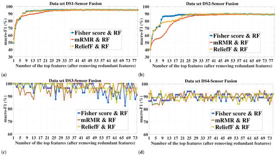 The range of is [0, 1]. In this paper, the condition for eliminating redundant features is . A threshold value that is too high might not effectively remove redundant features. On the other hand, a threshold value that is too low might also lead to removing significant features. A common trade-off choice of this threshold is 0.9, as in [52,53,54,55,56], which is also the Th value used in this paper. This step of eliminating redundant features will be implemented for each of the studied FS methods. It should be noted that, even for mRMR which takes the redundancy among features into account, this step will not affect the feature preference perceived by this method, since mRMR considers the more-relevant, dissimilar features more important than the less-relevant, redundant ones.