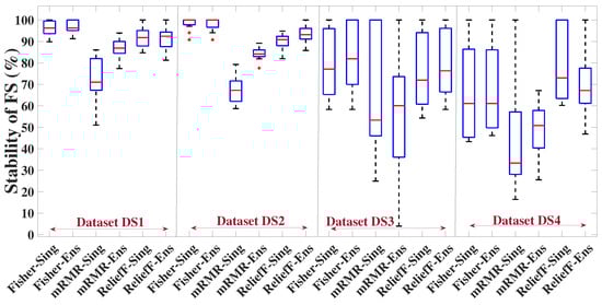 The stability of a given FS method reflects the sensitivity of its outcome to small perturbations (variations) in the input data [45]. As mentioned previously, this paper focuses on the data perturbations at the instance level. Thus, stability reflects the consistency of the selected features when different subsamples from the same data-generating process are input to the FS algorithm [19,20], i.e., it is indicative of the reproducibility of the selected features [21,46].
